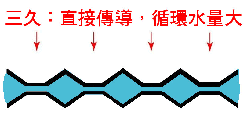2. 三久獨家採用板式集熱板,板內全部充滿了水,水量是管式的2.5倍以上。水量大、循環快,吸熱效率高,且不易結水垢。